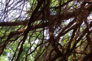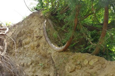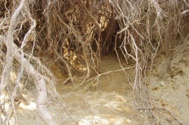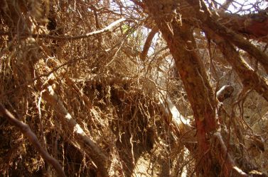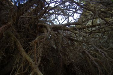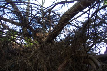 見晴らしのいい高台に、一本の枯木が立っている。その木の周囲の土を掘り起こし、根を露見させる。木は、木だけでなく、周囲のほかの木々や草、大地、太陽、空などすべてと関係を持ちながら存在している――そうした考えのもと、環境と状況を活かしながら木という存在を再認識させる。
